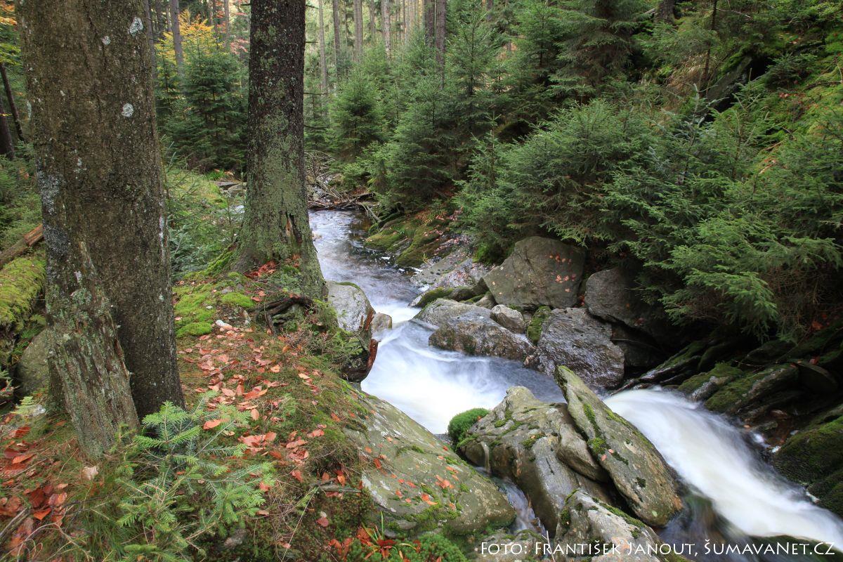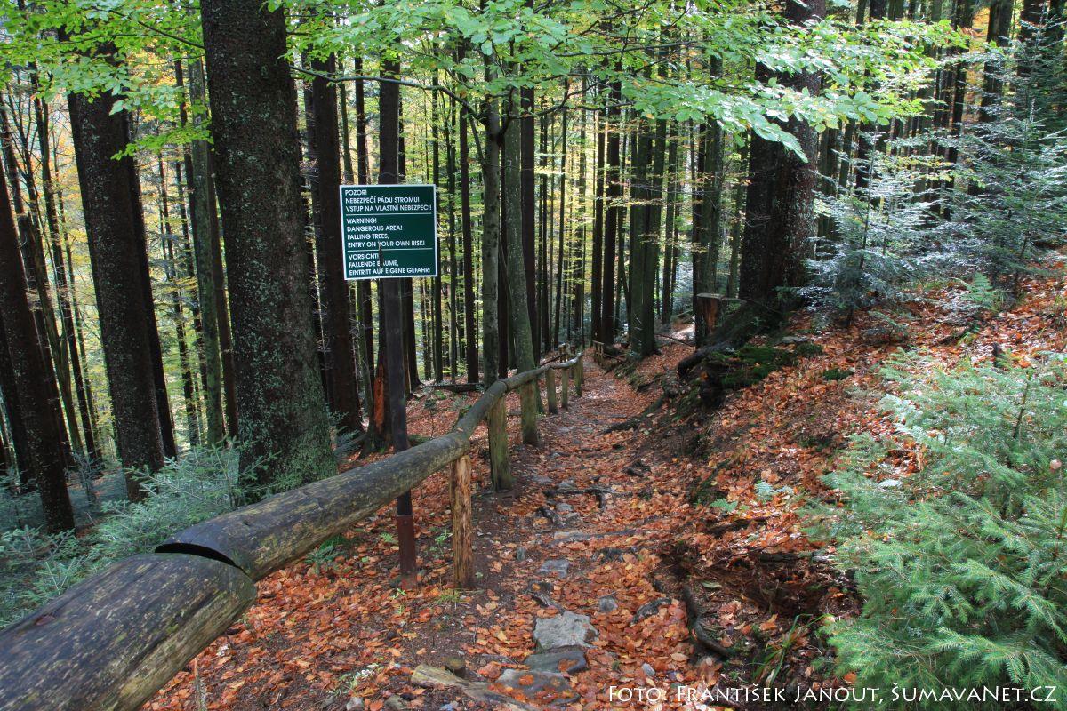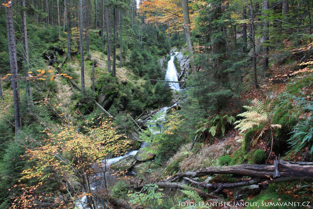 Růžová - Z parkoviště na Špičáckém sedle (C) vede 4 km po asfaltové silničce žlutá TZC k Černému jezeru. Pokud nechcete jít po červené TZC po břehu jezera, můžete si cestu o cca o 0,5 km zkrátit tím, že pokračujete od hráze po silničce. Na červenou TZC se po 500 m napojíte a po 2,7 km přijdete na odbočku k vodopádu Bílá strž. Délka trasy je 7,2 km